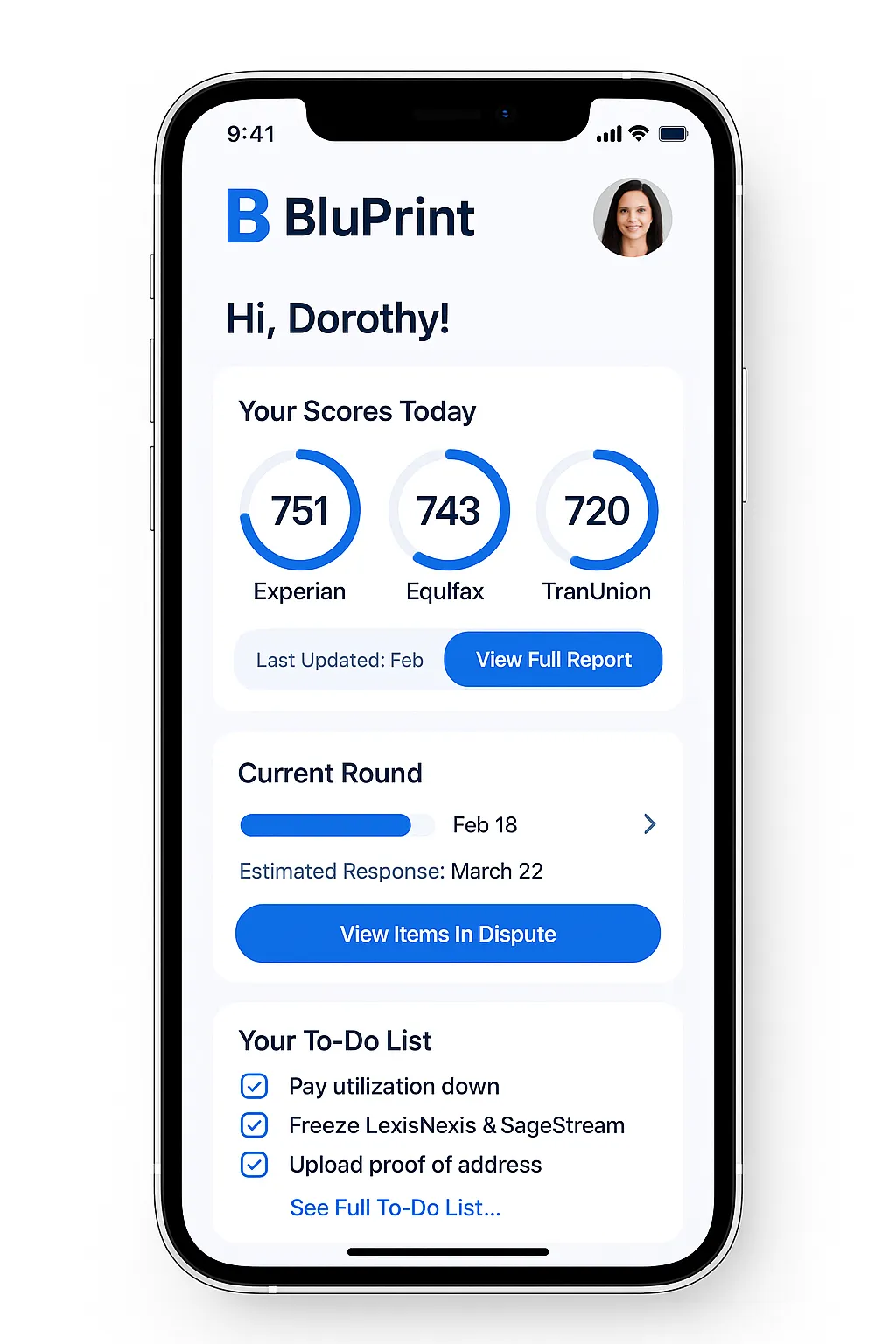 We’ll review your full credit report and show you what’s hurting your scores, what can be challenged, and the best strategy to move you forward—before you ever pay BluPrint a dime.